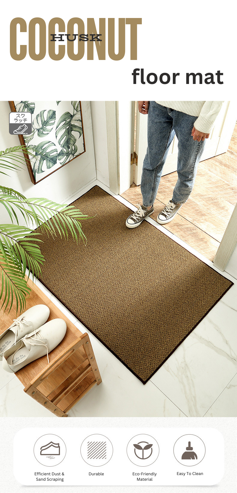 • Durable and Wear-Resistant: Made from robust coconut husk fibers, this mat is designed to withstand heavy foot traffic, ensuring long-lasting use.