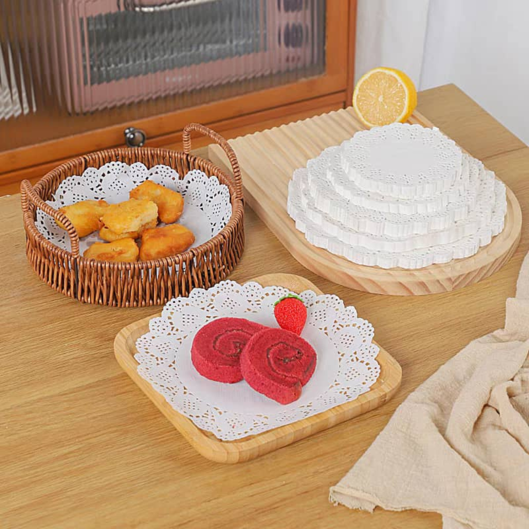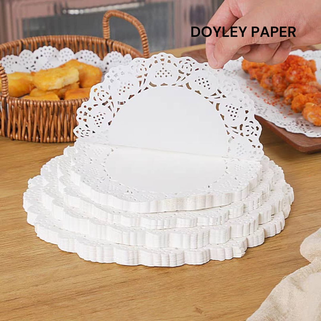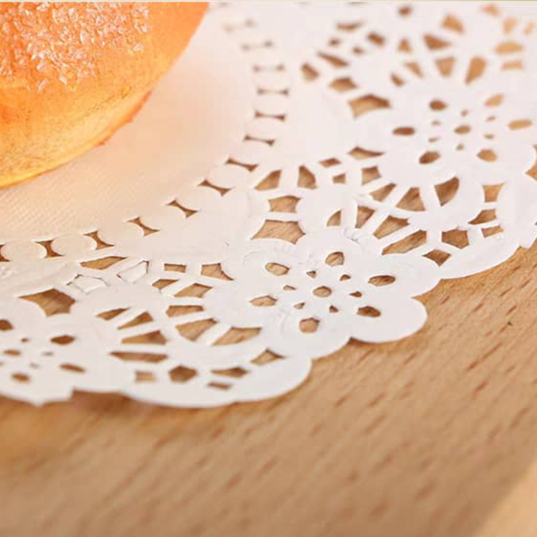 Enhance your food presentation with our elegant lace-patterned dolly paper, perfect for lining plates, trays, and baskets.