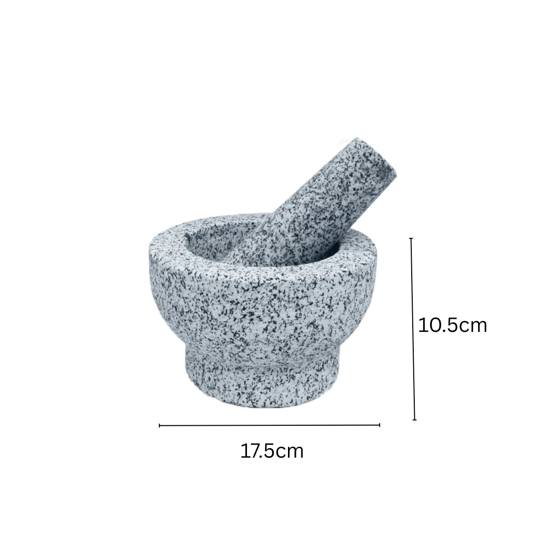 Crafted from unpolished granite for maximum durability and performance, this premium stone mortar and pestle set is perfect for grinding spices, herbs, and pastes with ease. Its rough interior texture ensures efficient grinding, while the sturdy base provides stability during use. With a generous bowl diameter of 17.5cm and a height of 10.5cm, it’s ideal for both everyday cooking and traditional recipes. Whether you’re making pesto, curry pastes, or crushing garlic, this natural stone tool adds an authentic touch to your kitchen.