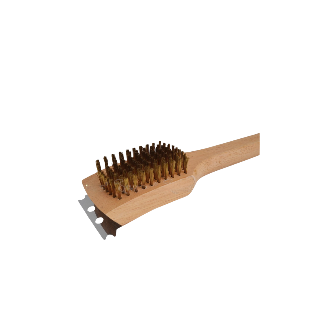 Featuring strong brass-wire bristles and a durable wooden handle measuring 45.5cm in length, it offers excellent leverage and a comfortable grip for deep cleaning even while the grill is still hot. The built-in metal scraper at the brush head adds extra cleaning power for stubborn buildup.