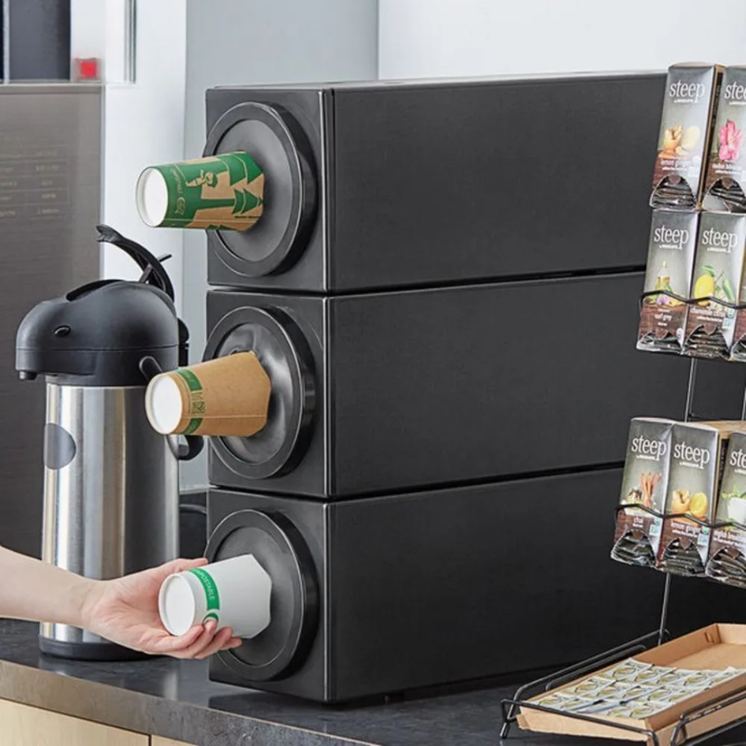 A sleek and practical solution for organizing and dispensing disposable cups in cafes, restaurants, offices, or self-service stations, for heavy use while maintaining a clean and professional appearance. Its stackable design and modular system allow for flexible placement and efficient use of counter space. The dispenser securely holds cups in place, making them easy to grab one at a time while preventing mess or waste. Compatible with a variety of cup sizes, this versatile holder enhances convenience and promotes hygiene, making it an essential accessory for any beverage-serving establishment.