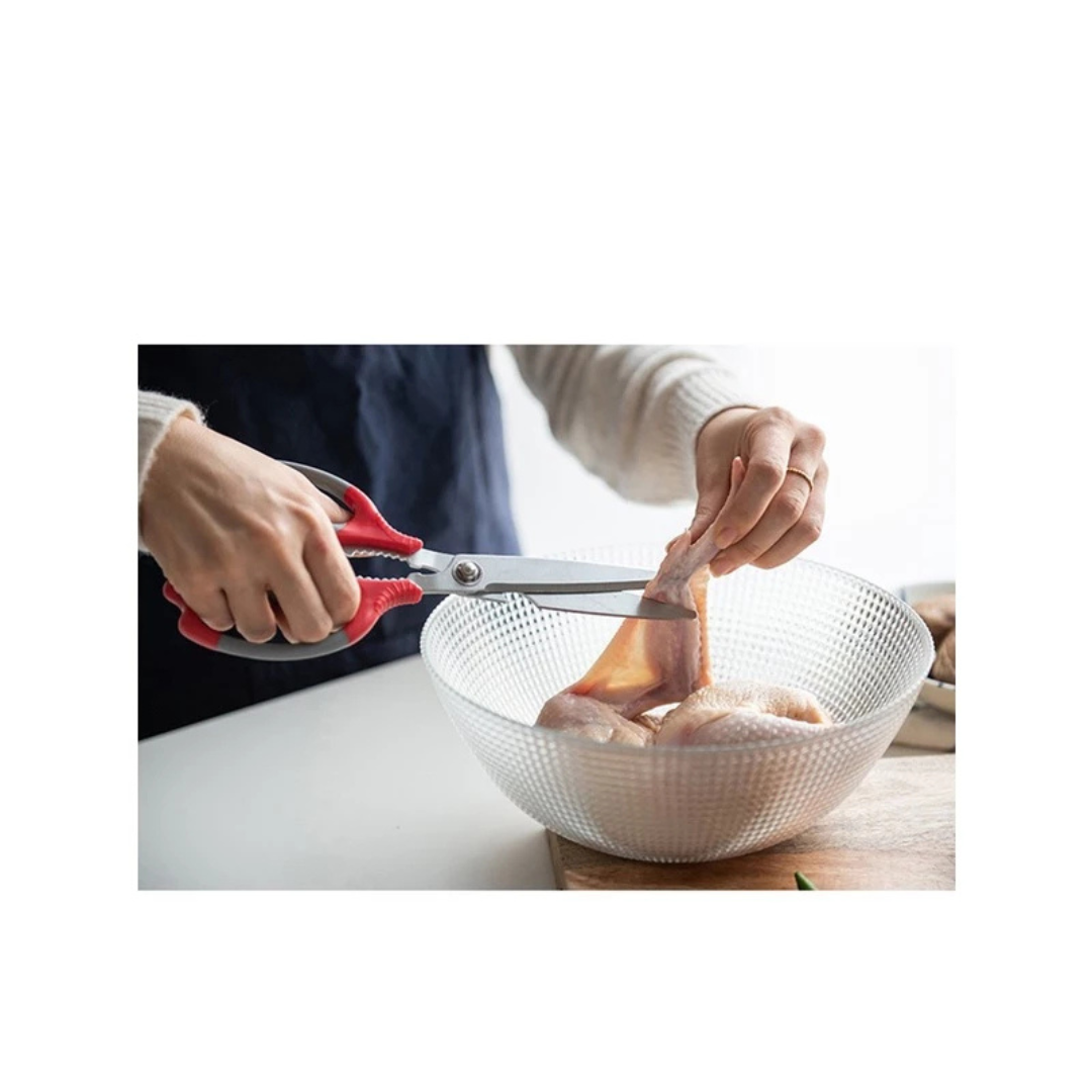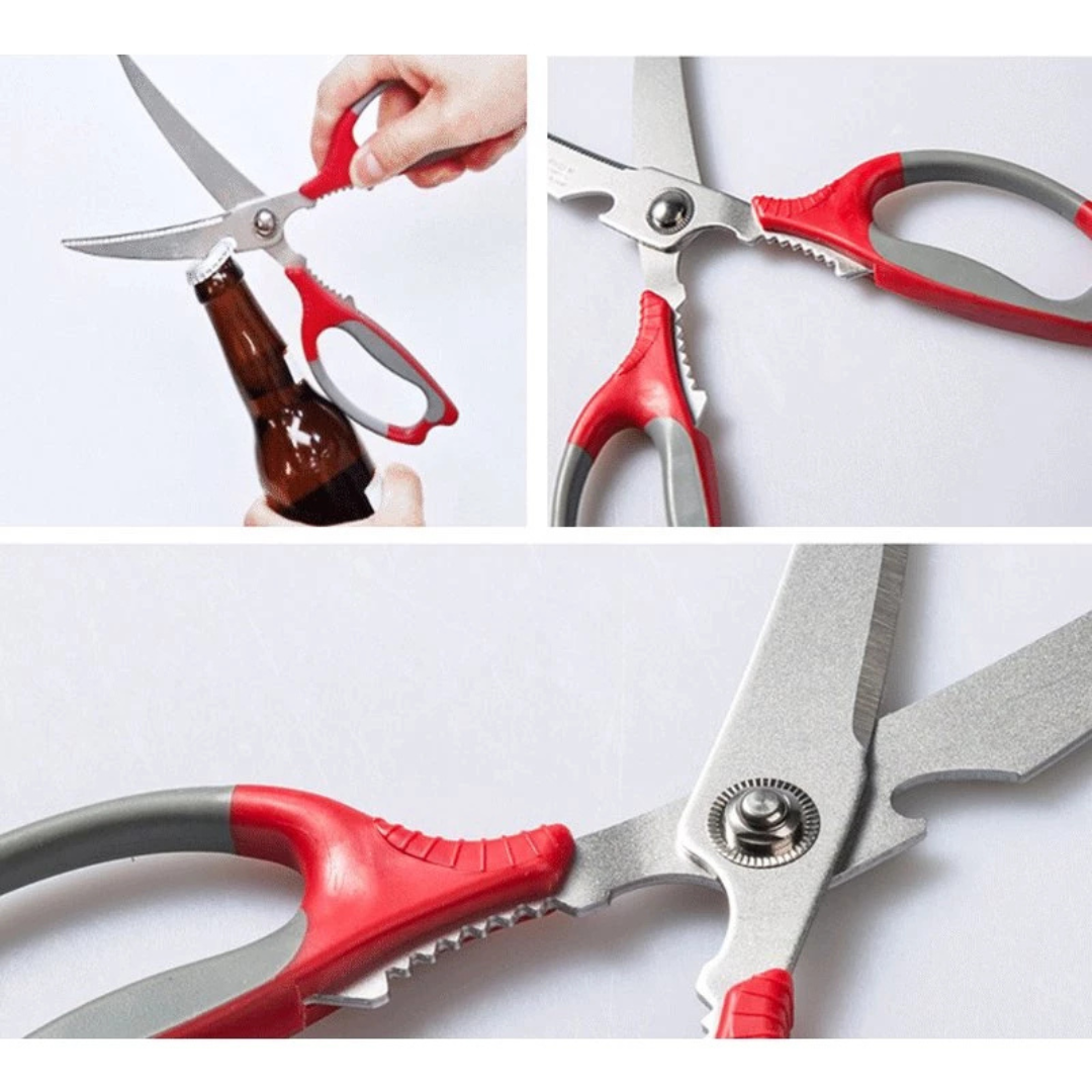 Featuring high-quality stainless steel blades, it can be used for cutting chicken bones, vegetables, and even fish. The ergonomic, non-slip handles provide a comfortable grip, ensuring precision and control while cutting. In addition to its cutting abilities, the shears comes with integrated features such as a nutcracker for cracking pecans and nuts, and a bottle opener for added convenience.