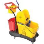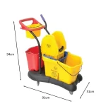 This rubbermaid-design multifunction single bucket wringer trolley is designed for heavy-duty cleaning tasks in commercial spaces. It features a sturdy frame with a large yellow bucket, a down-press wringer for efficient mop wringing, and additional compartments, including a red bucket for separating cleaning materials. The trolley is equipped with smooth-rolling swivel wheels for easy maneuverability and an ergonomic handle for comfort. It’s ideal for use in environments like malls, hospitals, and offices where large-scale cleaning is needed.