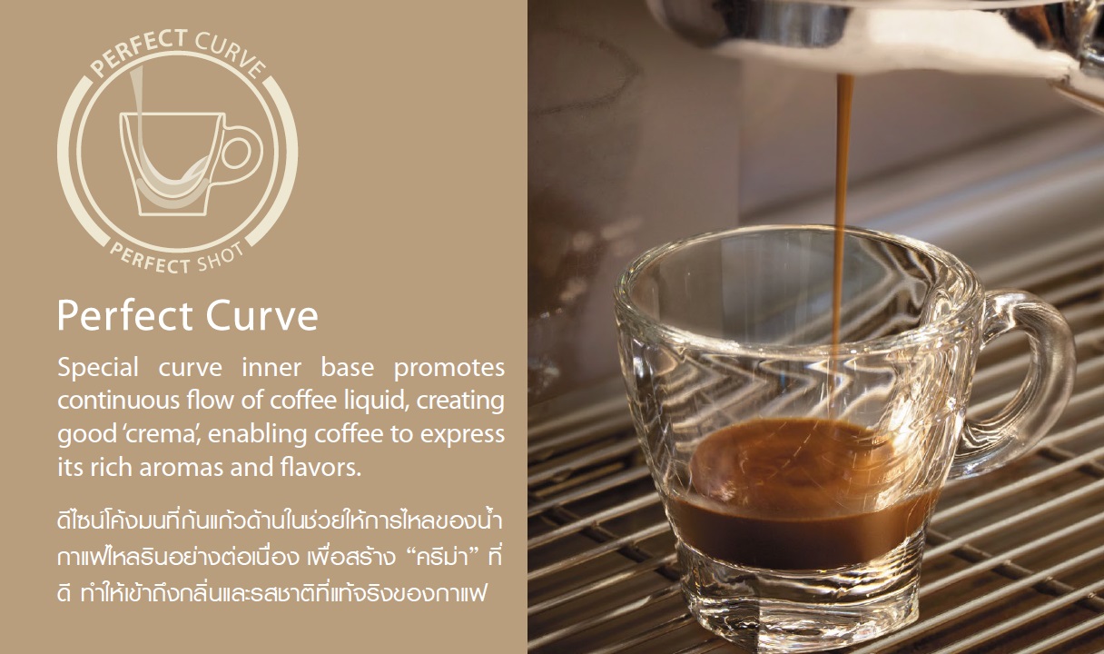 Caffe Premio, a collection of exceptional quality coffee glasses with special design and functionality for both food service professionals and coffee lovers who cherish the art of coffee crafting, encourages the freshness and the authentic taste of coffee. Perfect Curve, special curve at inner base promotes continuous flow of coffee, creates a fine ‘crema’, and enables coffee to express its rich aromas and flavors. Extra Thickness keeps coffee at the right temperature, so coffee freshness lasts longer.