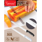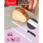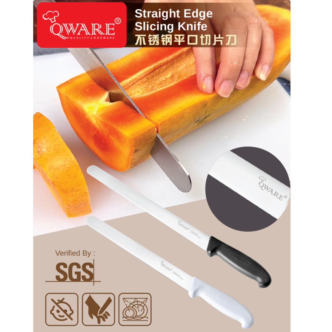 This high-quality stainless steel slicing knife is perfect for precise, effortless cutting. Available in both a wavy / coarse serrated edge for slicing bread ; and a plain straight edge for smooth, controlled cuts on cakes, fruits and vegetables, this knife is versatile for all your kitchen needs. The ergonomic handle provides a comfortable grip, comes in 2 color coding options (i.e. white or black); while the blade’s durable stainless steel construction ensures long-lasting sharpness and resistance to rust.