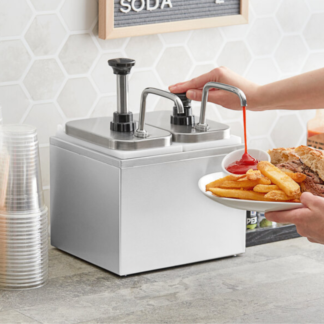 This condiment dispenser is perfect for dispensing thin or thick condiments of ambient temperatures. It is perfect for dispensing syrups or thicker condiments like ketchup, mustard, or barbecue sauce! This unit, a professional solution for your establishment, is designed for high-volume use.