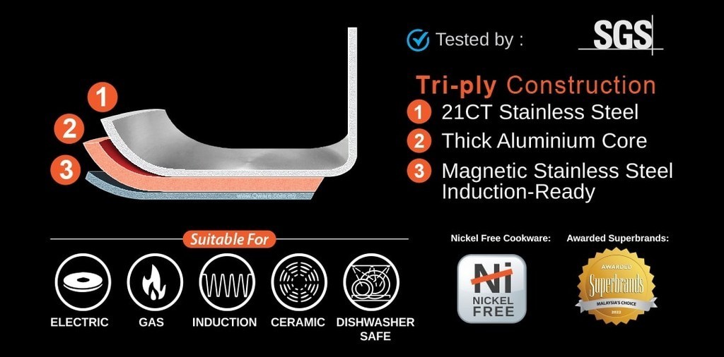Qware® Sandwich Bottom Curved Saute Pan formed in one-piece molding and the curved sides enable thorough and efficient whisking of ingredients even at high temperatures, comes in 3 different sizes with capacity ranging as small as 0.95 litres to as large as 2.85 litres. Built to last, its tri-ply construction incorporates High Corrosion Resistance 21CT Stainless Steel, Thick Aluminum Core and Magnetic Stainless Steel. The first layer of the tri-ply structure is 21CT Stainless Steel Body where it is designed for better food safety, as it not only enhances its durability, ease of maintenance and cleaning, but also ensure your food does not react chemically (nickel free) with the cookware. An aluminum core ensure superior heat conductivity evenly throughout the entire pan and eliminate hotspots to optimize cooking performance, while magnetic stainless steel bottom is induction compatible and well-suited on all kind of cooktops (electrical, ceramic, gas & induction).