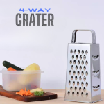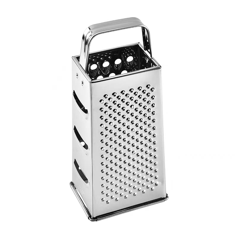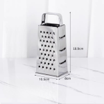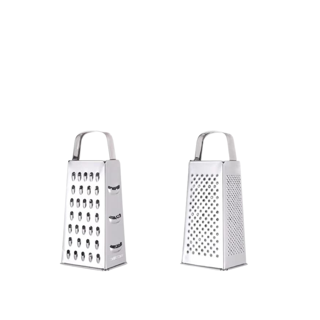 This stainless steel four-sided grater is a versatile kitchen tool perfect for grating, slicing, and shredding vegetables, cheese, and more. Each side features different blade types, offering options for fine grating, coarse shredding, and slicing. This multipurpose grater is easy to clean and compact enough to store efficiently, making it an essential tool for any kitchen.