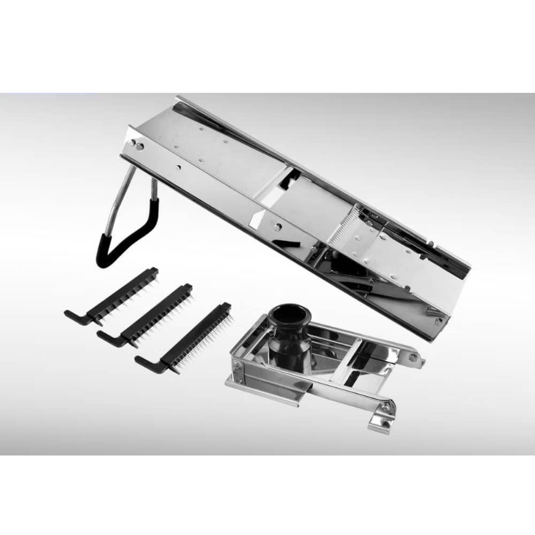 This Multi Purpose Slicer comes with an adjustment dial, allowing the user to create slices of varying thicknesses. In addition to the built-in straight blade and built-in serrated blade, it also includes 3 extra blades that come in a storage box for added convenience. These features will allow you to slice, crinkle, waffle, and julienne a wide variety of fruits and vegetables with ease.